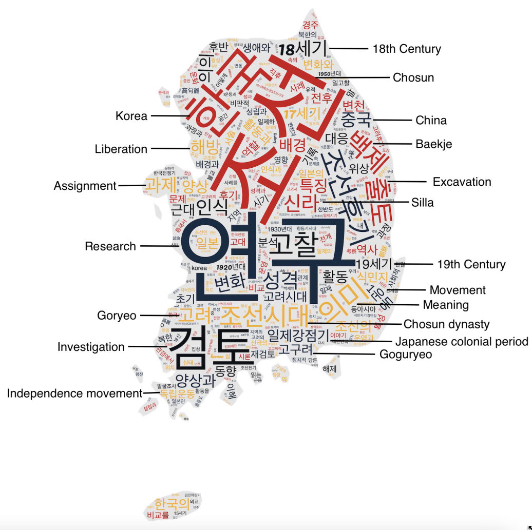Chosun(조선), Korea(한국), Research(연구), Investigation(검토), Baekje(백제)*, Silla(신라)**, Excavation(출토), Goguryeo(고구려), Liberation(해방), Movement(운동), and Japanese Colonial Period(일제강점기).