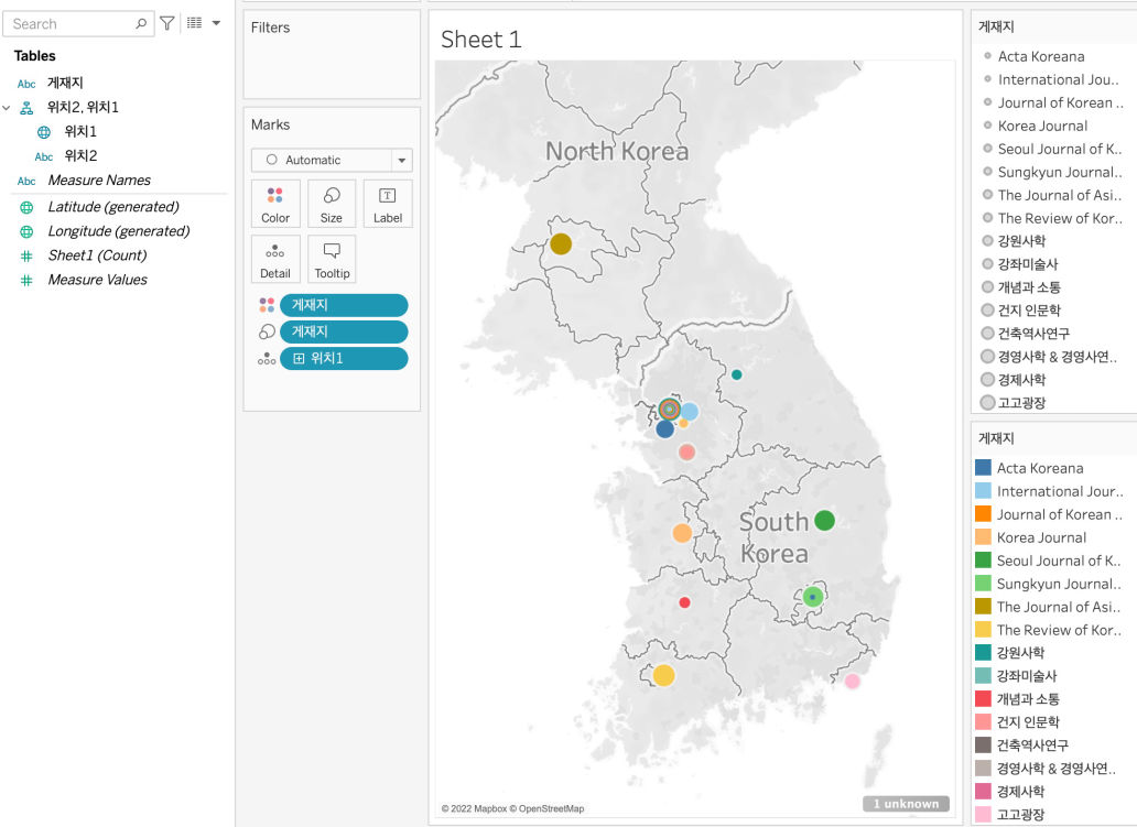 From this map, we can see the most publishers, including International Journal of Korean History, 건지인문학, and Acta Koreana, are located in Seoul, South Korea.